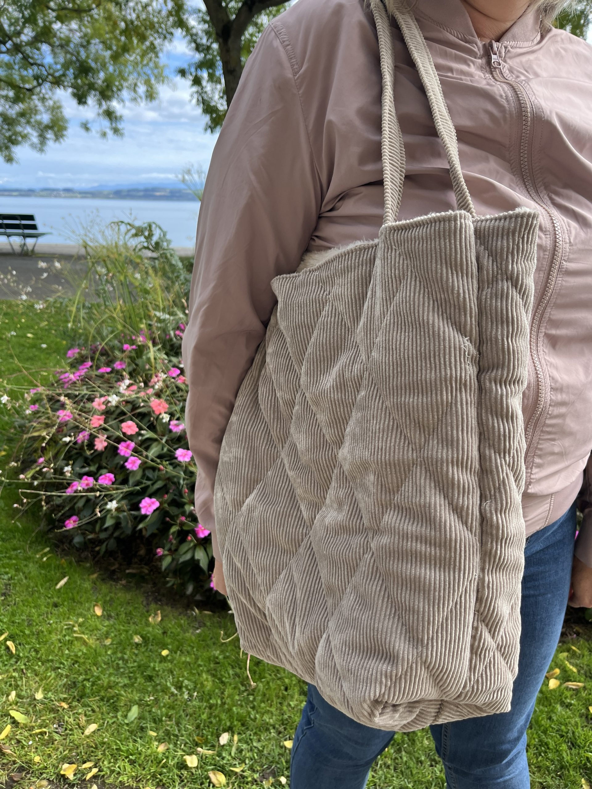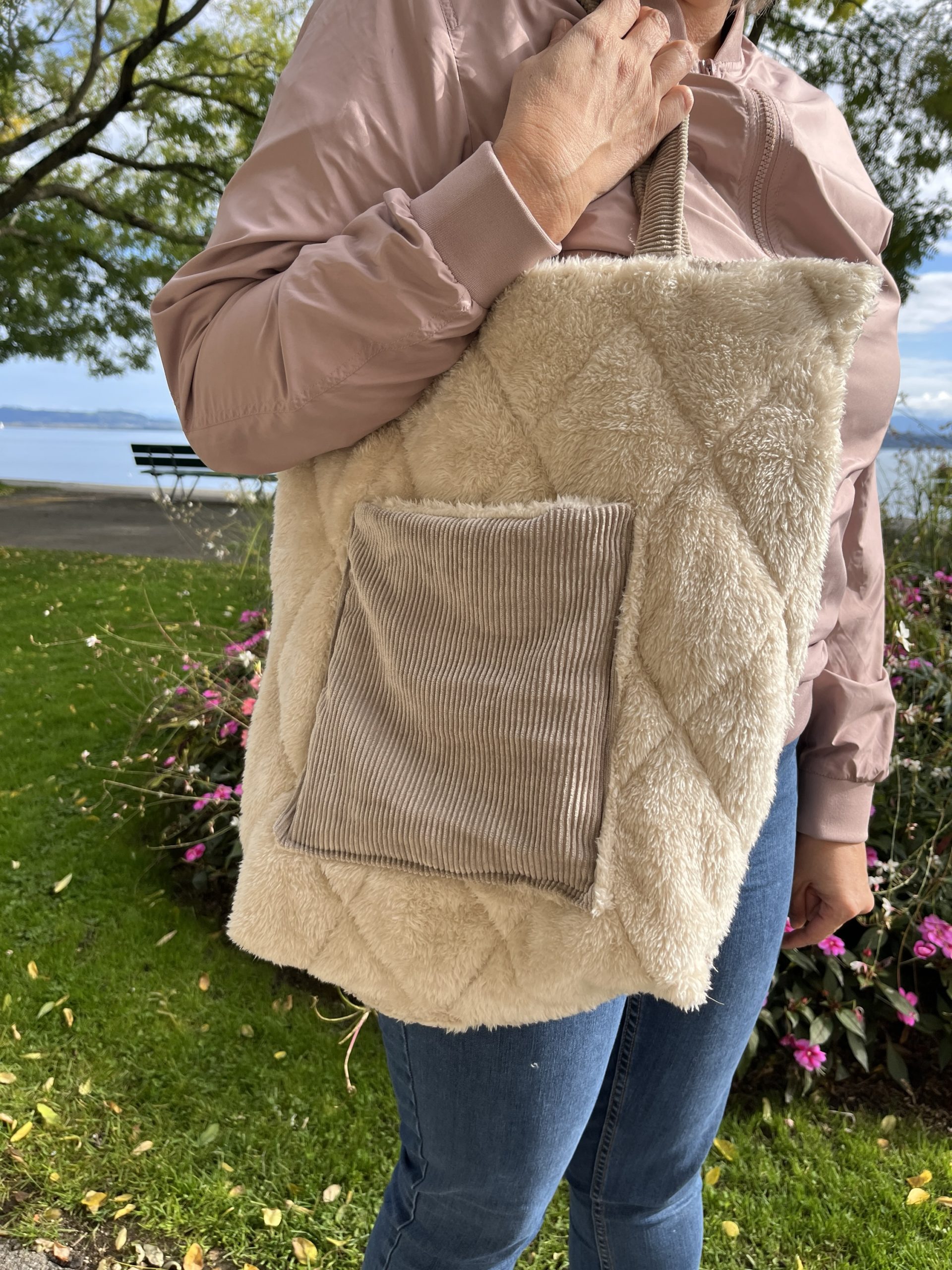 Sac en velours côtelé ou doudous avec poche et fermeture éclair, doublure coton 35cm/35cm